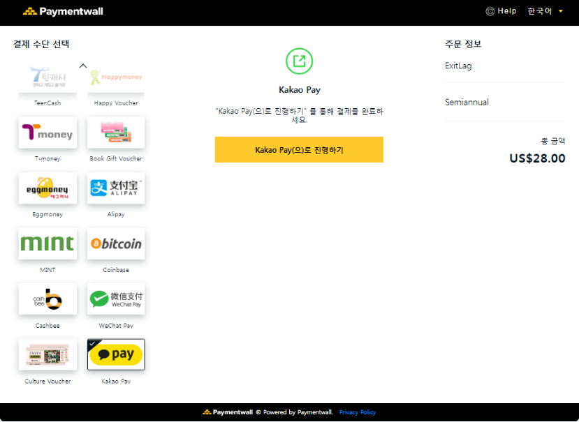 그리고 CONTINUE WITH PAYMENTWALL을 누르시면 다음 화면으로 넘어가는데요. Others(기타)를 고르셨다면, 다음과 같은 화면으로 카카오페이나 틴캐시 문화상품권으로 결제할 수 있는 탭이 나옵니다.