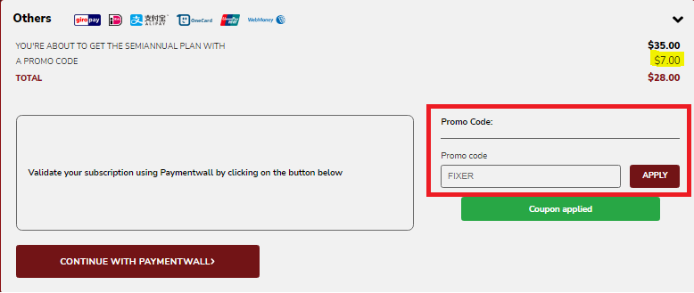 그리고 위에 있는 할인 프로모션 코드 FIXER를 입력하시고 APPLY를 누르시면, 6개월 구독권 기준 7달러( 약 8천원/ 20% )이 할인된 것을 보실 수 있습니다.